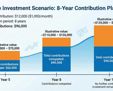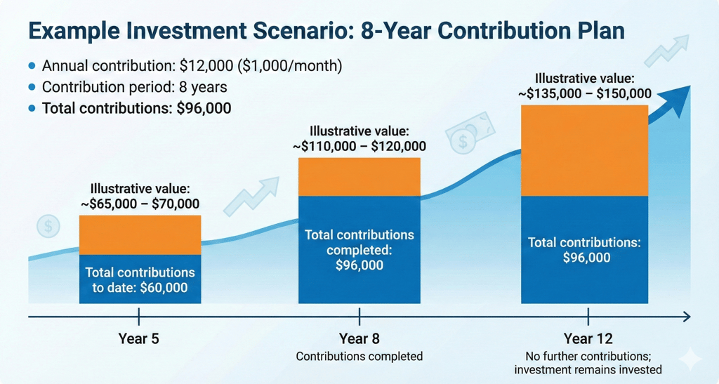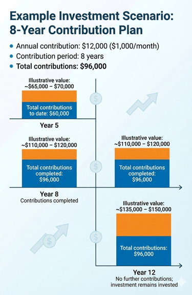 Long-term wealth planning works best when time is allowed to do its work. This approach is structured around an initial contribution period, with the flexibility to remain invested beyond that to support longer-term goals.